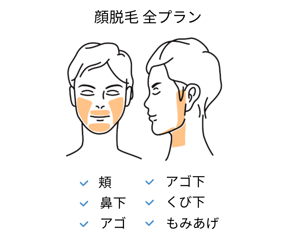 「顔脱毛 全部位プラン」は、男性の顔の悩みを根本から解決し、清潔感と好感度を格段にアップさせます。口周り、アゴ、アゴ下、首、頬、もみあげといった顔の気になる部位すべてを網羅し、つるんとしたなめらかな肌へと導きます。